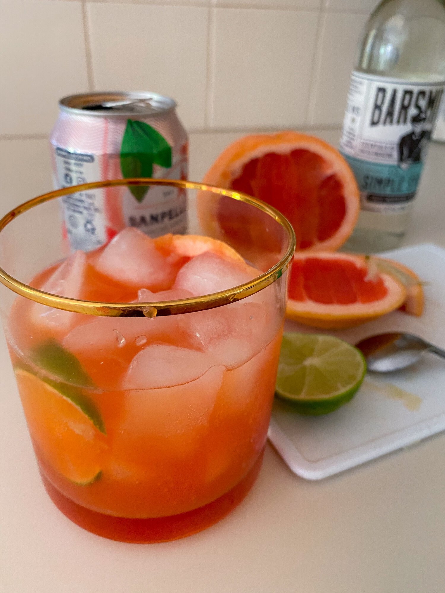 - Serve over ice with lime and grapefruit wedge