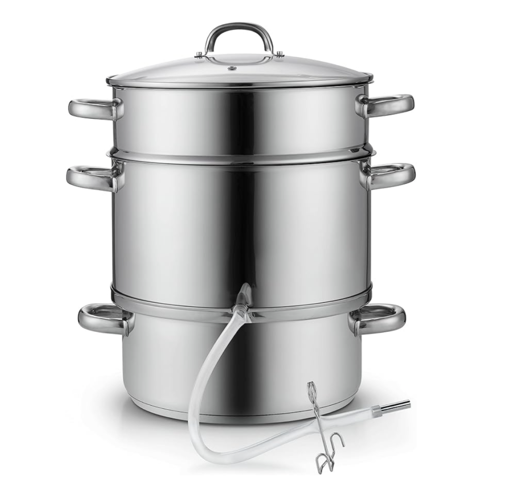 [I’ll link to the steam juicer I use here]—and if you do get a steam juicer, I recommend the one I’m linking to specifically. It’s larger, and you’re going to want to make a lot of juice, not have a smaller pot just because it costs a little bit less. It’s not going to work out.